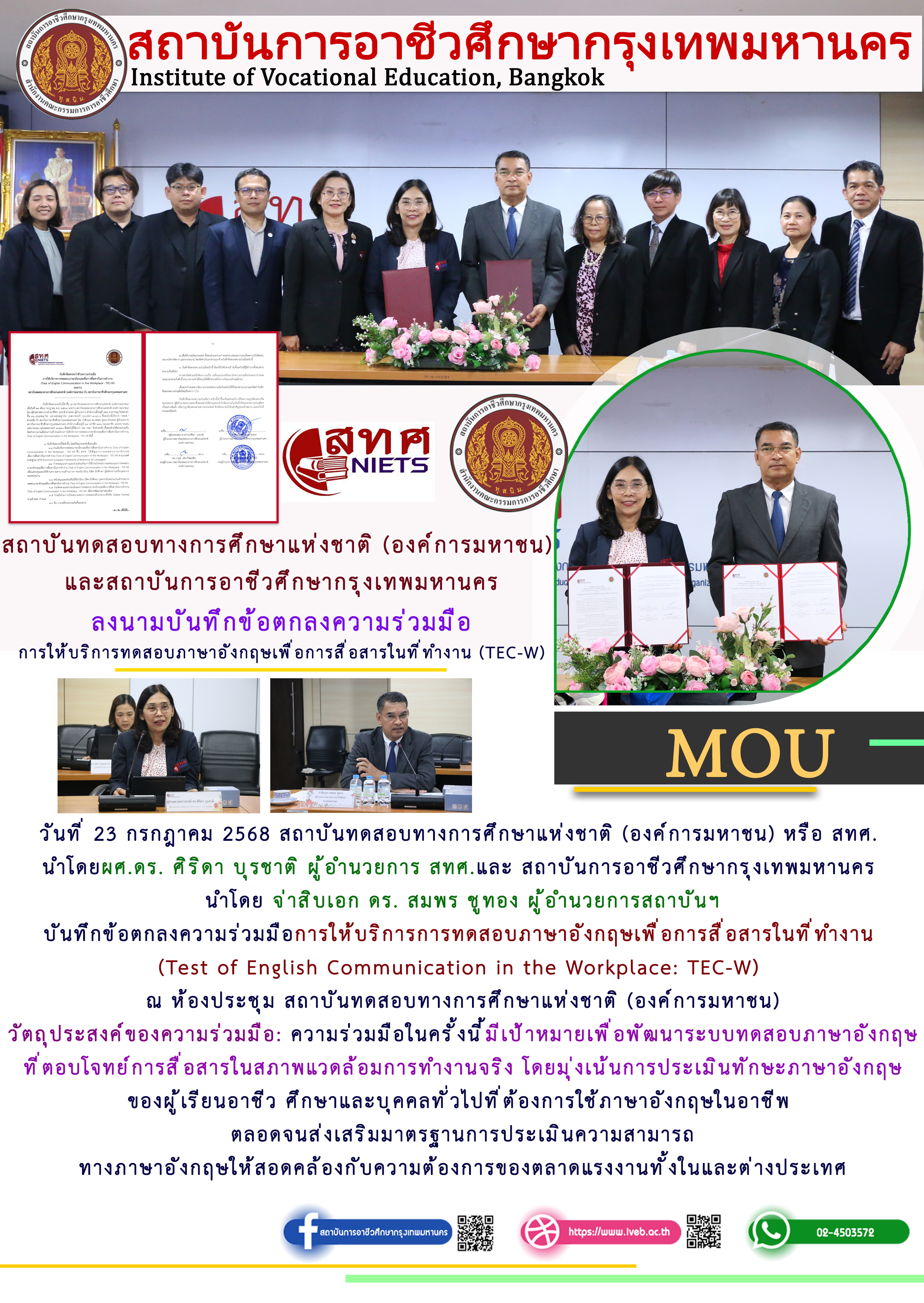 สถาบันทดสอบทางการศึกษาแห่งชาติ (องค์การมหาชน) และสถาบันการอาชีวศึกษากรุงเทพมหานคร ลงนามบันทึกข้อตกลงความร่วมมือการให้บริการทดสอบภาษาอังกฤษเพื่อการสื่อสารในที่ทำงาน (TEC-W) 23 ก.ค. 2568