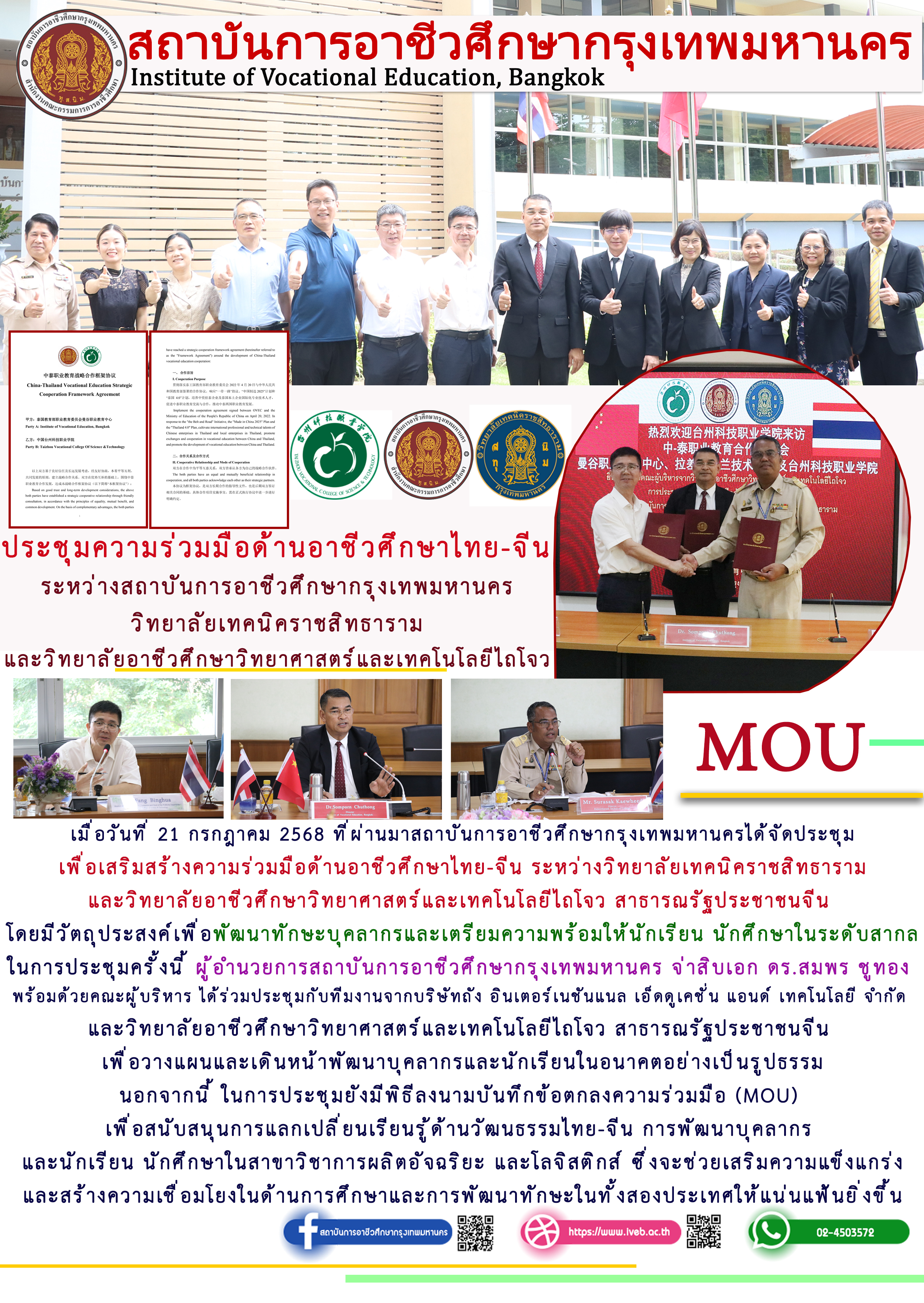 ประชุมความร่วมมือด้านอาชีวศึกษาไทย-จีน ระหว่างสถาบันการอาชีวศึกษากรุงเทพมหานคร วิทยาลัยเทคนิคราชสิทธาราม และวิทยาลัยอาชีวศึกษาวิทยาศาสตร์และเทคโนโลยีไถโจว 21 ก.ค. 2568