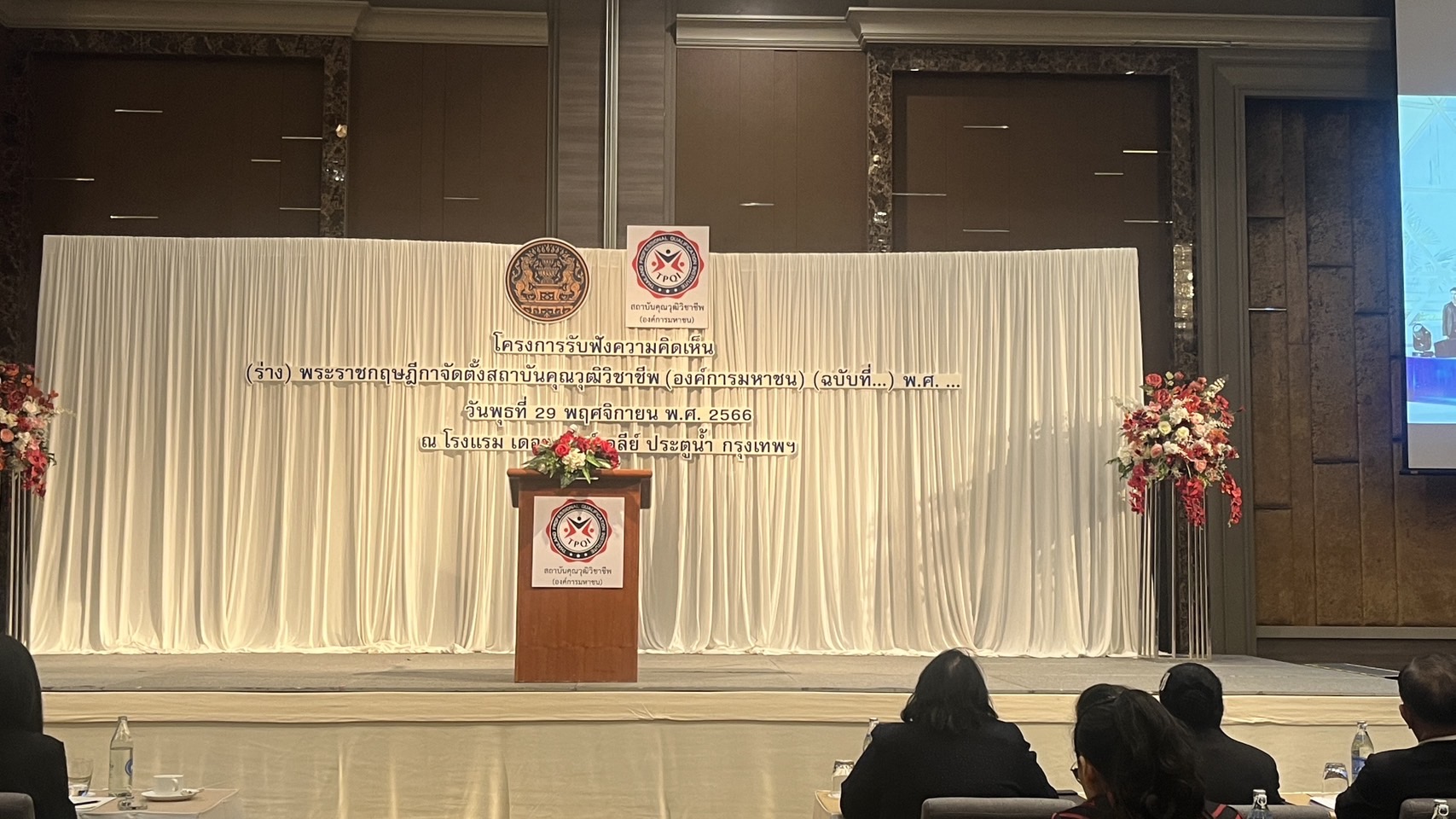 วันพุธที่ 29 พฤศจิกายน 2566 ดร.ชมพูนุช บัวบังศร ผู้อำนวยการสถาบันการอาชีวศึกษากรุงเทพมหานคร และ นางสุวรรณา ลิ้นทอง ผู้ช่วยผู้อำนวยการสถาบันการอาชีวศึกษากรุงเทพมหานคร เข้าร่วมงานรับฟังความเห็นการจัดทำ (ร่าง) พระราชกฤษฎีกาจัดตั้งสถาบันคุณวุฒิวิชาชีพ (องค์การมหาชน) (ฉบับที่ ..) พ.ศ. …. ณ โรงแรม เดอะเบอร์เคลีย์ ประตูน้ำ (The Berkeley Hotel Pratunam Bangkok) ชั้น 11 ห้องประชุม Mayfair Ballroom
