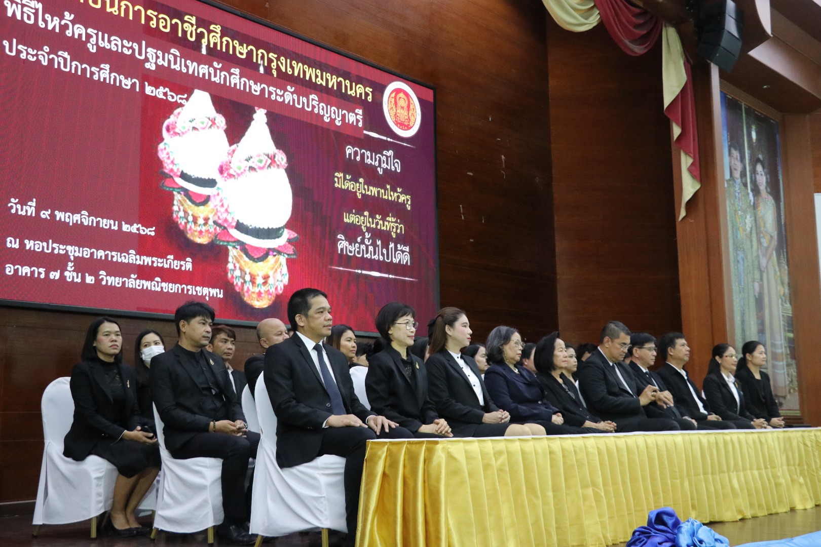 วันที่ 9 พฤศจิกายน 2568 สถาบันการอาชีวศึกษากรุงเทพมหานคร จัดพิธีไหว้ครูและปฐมนิเทศนักศึกษาระดับปริญญาตรี สายเทคโนโลยีหรือสายปฏิบัติการ ประจำปีการศึกษา 2568 ณ หอประชุมเฉลิมพระเกียรติ อาคาร 7 ชั้น 2 วิทยาลัยพณิชยการเชตุพน โดยได้รับเกีรติจาก ดร.ศิริพรรณ ชุมนุม นายกสภาสถาบันการอาชีวศึกษากรุงเทพมหานคร เป็นประธานในพิธี กล่าวรายงานวัตถุประสงค์ของโครงการโดย จ่าสิบเอก ดร.สมพร ชูทอง ผู้อำนวยการสถาบันการอาชีวศึกษากรุงเทพมหานคร และกล่าวต้อนรับโดย ดร.คณัสนันท์พรรณ ผลทำมีบุญ ผู้อำนวยการวิทยาลัยพณิชยการเชตุพน