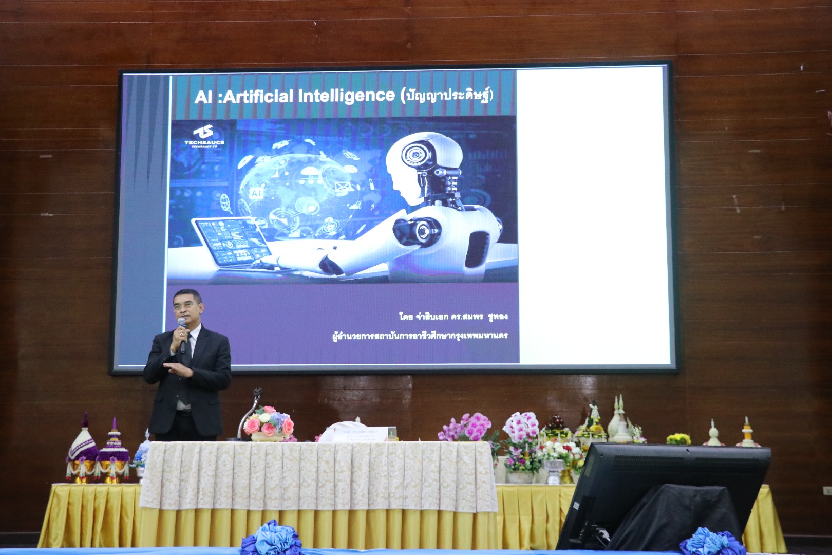 การบรรยาย ให้ความรู้เรื่องเกี่ยวกับการเป็นนักศึกษาระดับปริญญาตรี ของสถาบันการอาชีวศึกษากรุงเทพมหานคร โดยนายศักดา มยูขโชติ ดร.ผ่องพรรณ จรัสจินดารัตน์ รองผู้อำนวยการสถาบ้นการอาชีวศึกษากรุงเทพมหานคร และ ดร.ณัฐยา สลับสม ผู้อำนวยการอาชีวศึกษาบัณฑิต